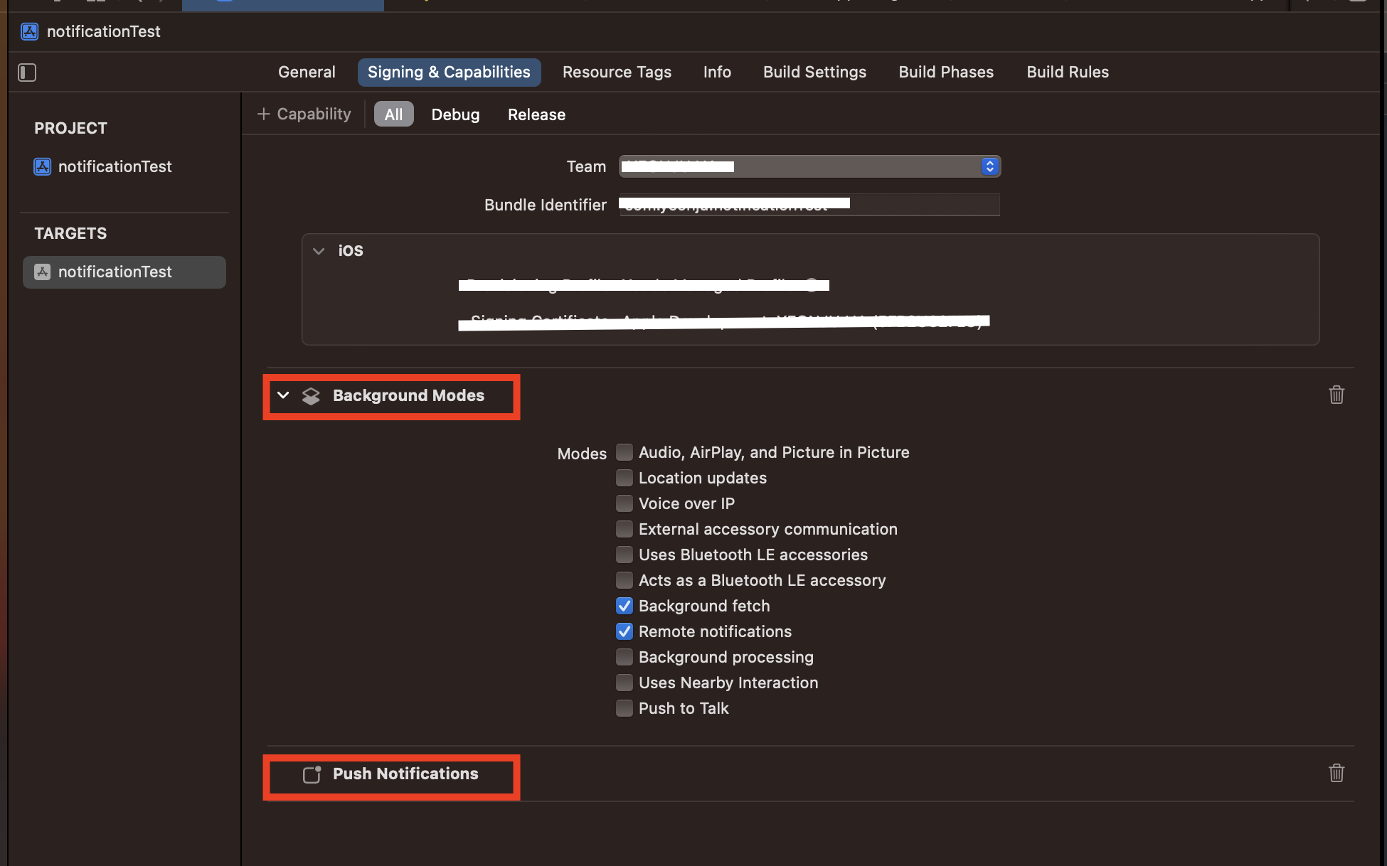원인 2) Xcode 에서 target - Capabilities tab 에서 Push Notification & Background Mode 를 추가해야하고 Background Mode 에서는 Background Fetch 와 Remote Notification 을 활성화해야한다.