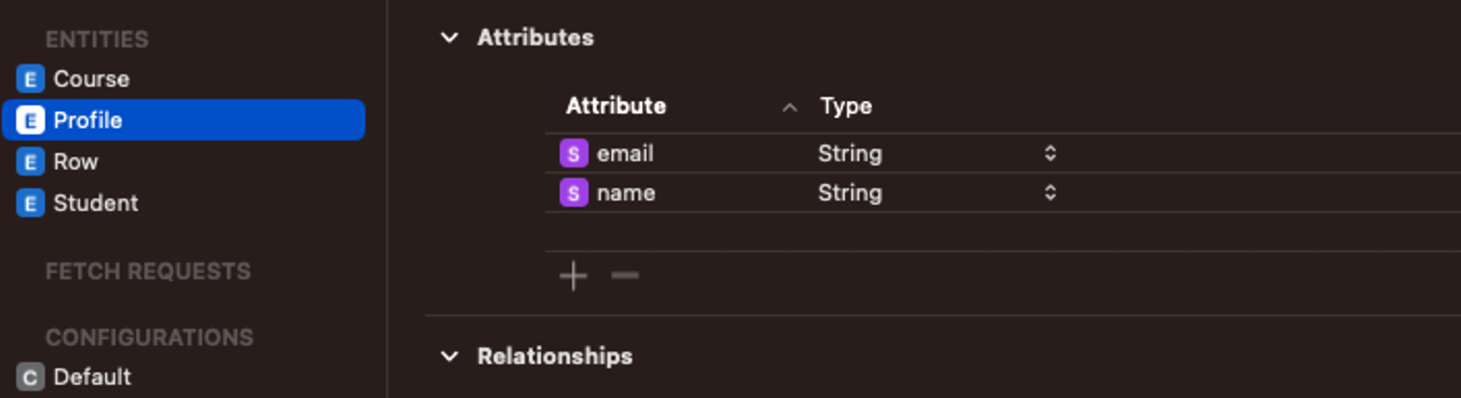 Entity를 만들었으면 addAttribute를 눌러서 그 안에 어떤 속성들을 저장해 줄 것인지 설정해 주면 됩니다. Profile이라는 Entity 내에 email, name이라는 속성들을 저장해주고 싶다면 이렇게 해주면 되겠죠? 그리고 타입까지 잘 설정해 줍니다!