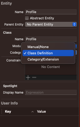 코어데이터와 관련한 코드를 자동으로 생성할지, 수동으로 만들어줄지를 Codegen을 통해 결정할 수 있는데요. 우리가 지금까지 Entity, Attribute 및 relationship를 정의해 줬잖아요?? 그럼 이제 Entity 인스턴스를 만드는 데 사용할 클래스를 지정해야 하기 때문에 이 항목을 설정해주어야 하는 거예요..