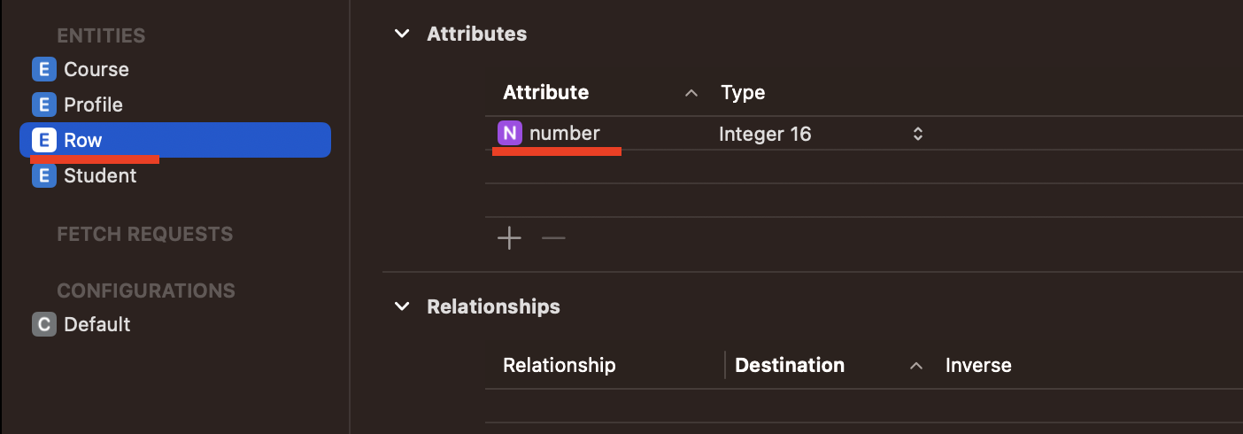 저는 Entity 이름은 Row로, 테이블뷰에 행이 추가됨에 따라 업데이트할 배열의 요소 개수를 number라는 attribute로 설