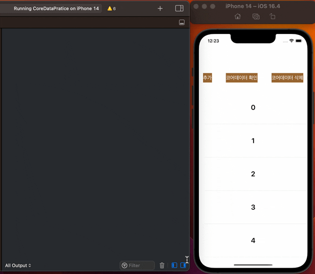 그리고 '코어데이터 확인' 버튼을 눌렀을 때 print 해서 core data에 저장되어 있는 값을 확인할 수 있도록,