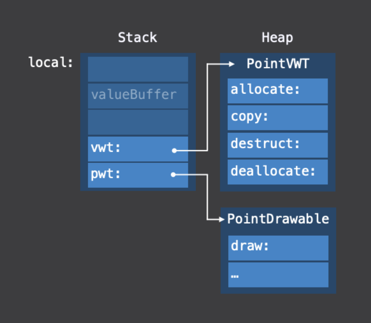자.. VWT에 대한 포인터와 PWT에 대한 포인터는 각각 Existential Container의 VWT와 PWT에 저장되어 있는다고 했다. 그럼 실제 VWT와 PWT는 어디에 저장되어 있는 걸까?? 자료에서 보면 Heap영역인 것 같다…?