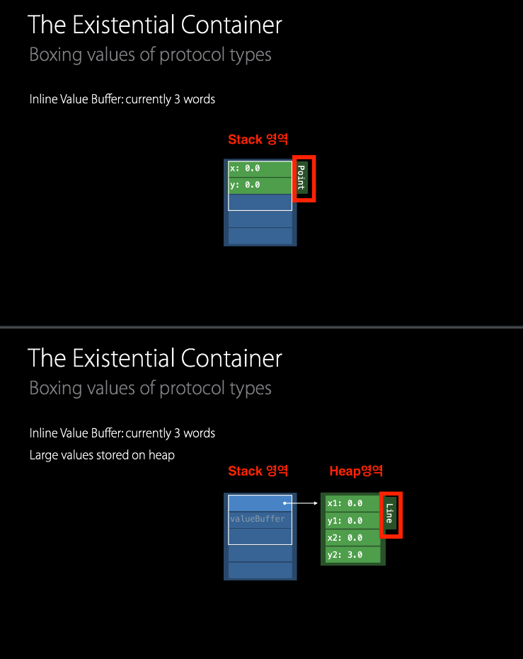 But, value buffer 크기를 초과하든 초과하지 않든 구조체이기 때문에 Existential Container는 두 경우 모두 Stack에 저장된다.