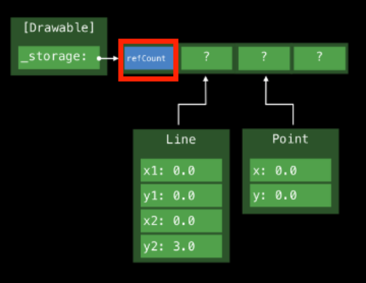 이 상황에서 Point의 저장속성 값은 inline으로 buffer에 저장될 수 있는 것이고, 3 words를 초과하는 Line의 저장속성은 힙 영역에 따로 저장되어야 한다. 그리고 이 경우 힙 영역을 가리키는 포인터를 buffer에 위치시킨다.