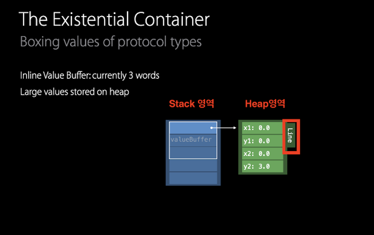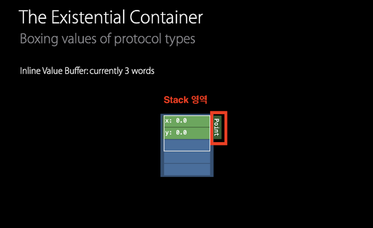 - 작은 메모리 크기의 struct의 경우 저장 프로퍼티의 값이 value buffer용량을 초과하지 않기 때문에 stack 영역의 existential container 내부에 저장되며