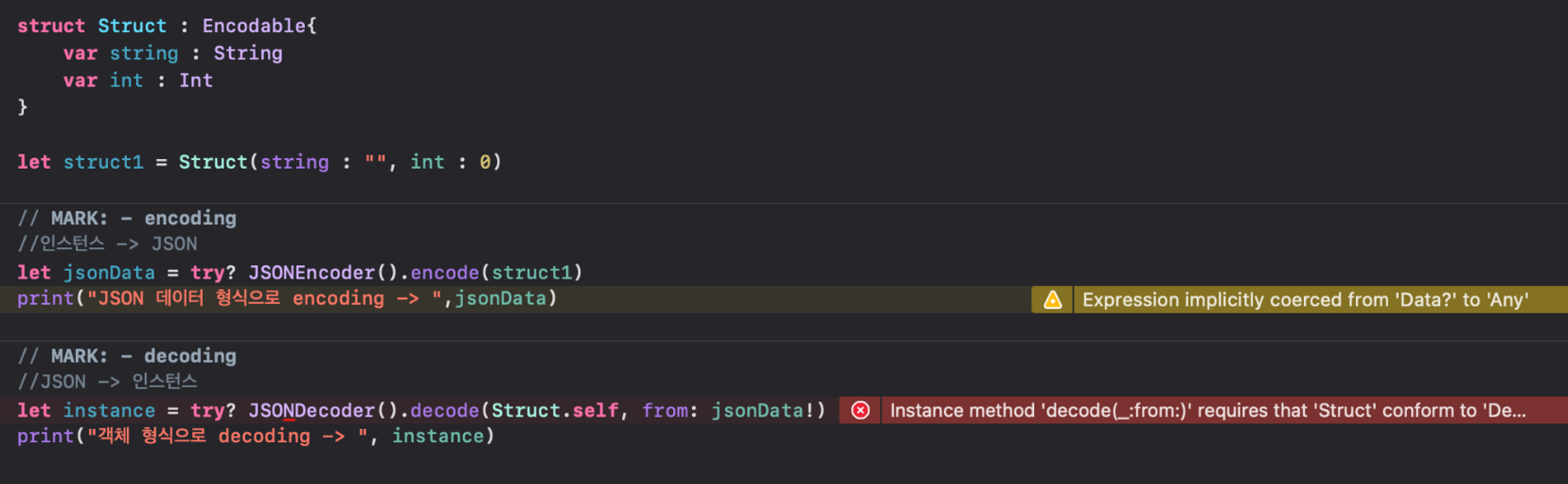 아까 인코딩에서 에러 났던 것처럼 디코딩해 줄 건데 왜 인스턴스의 타입인 Struct가 ‘Decodable’을 준수하지 않냐!는겁니다