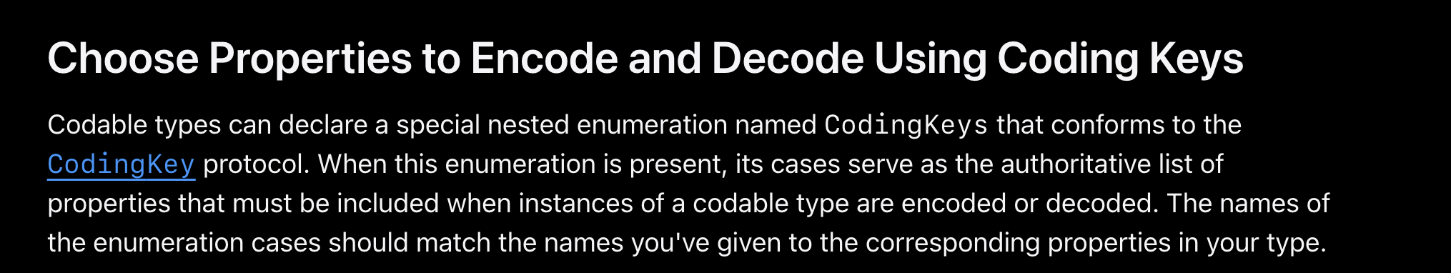 - Codable 유형은 CodingKey 프로토콜을 준수하는 CodingKeys라는 특수 중첩 열거형을 선언할 수 있습니다.
