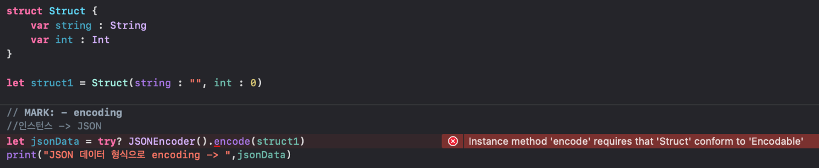 인코딩해줄 건데 왜 인스턴스의 타입인 Struct가 ‘Encodable’을 준수하지 않냐!는겁니다