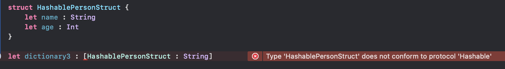 Hashable한 타입만 넣을 수 있는 딕셔너리의 key 자리에 구조체 타입을 그냥 넣어주면 에러