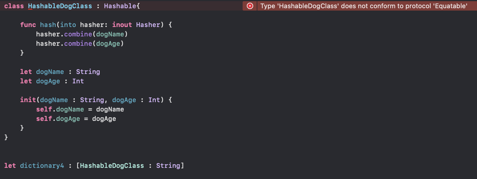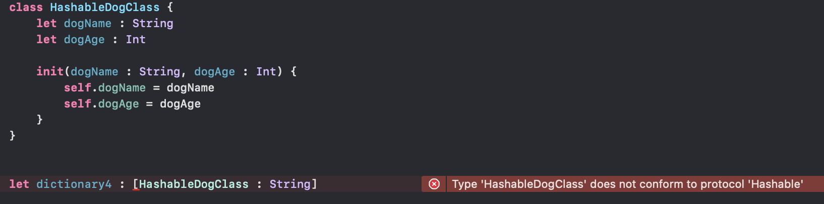let dictionary4 : [HashableDogClass : String]