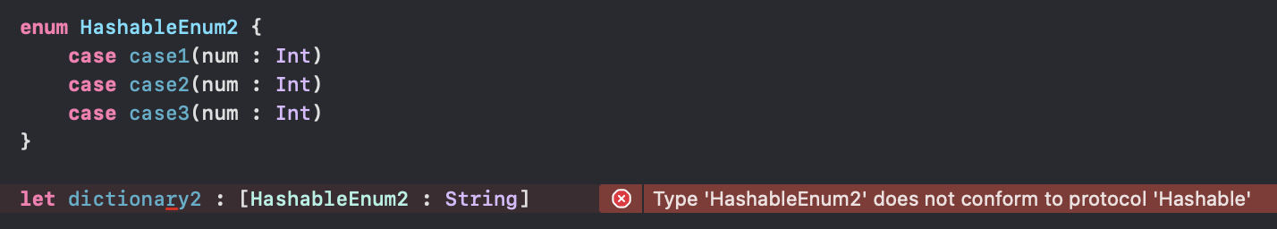 연관값 없는 열거형은 정의하면 자동으로 Hashable 을 준수하게 된다.