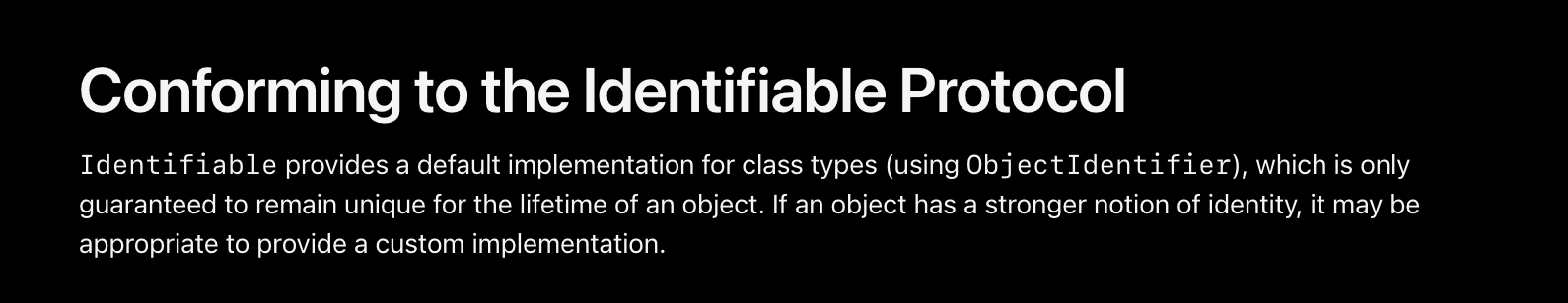dentifiable라는 프로토콜을 사용하면, Identifiable 프로토콜을 채택한 타입은 고유 개채를 구분하기 위해서 비교 알고리즘에 이 id(라는 프로퍼티)를 사용하게 되고 id가 다르다면 서로 다른 대상이 되는 것이며, 값이 다르더라도 id가 같으면 동일한 개체로 구분되게 되는 것입니다.