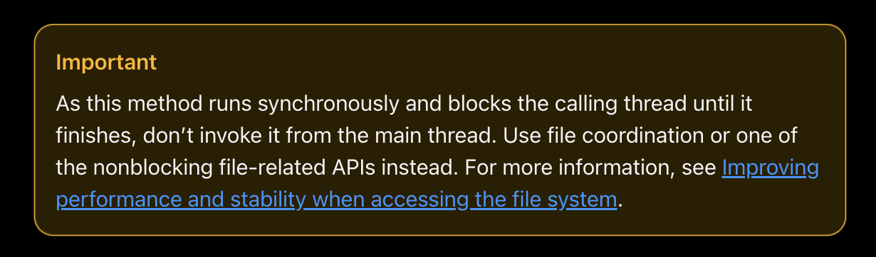 대신 file coordination이나 nonblocking file-related APIs 중 하나를 사용하세요.