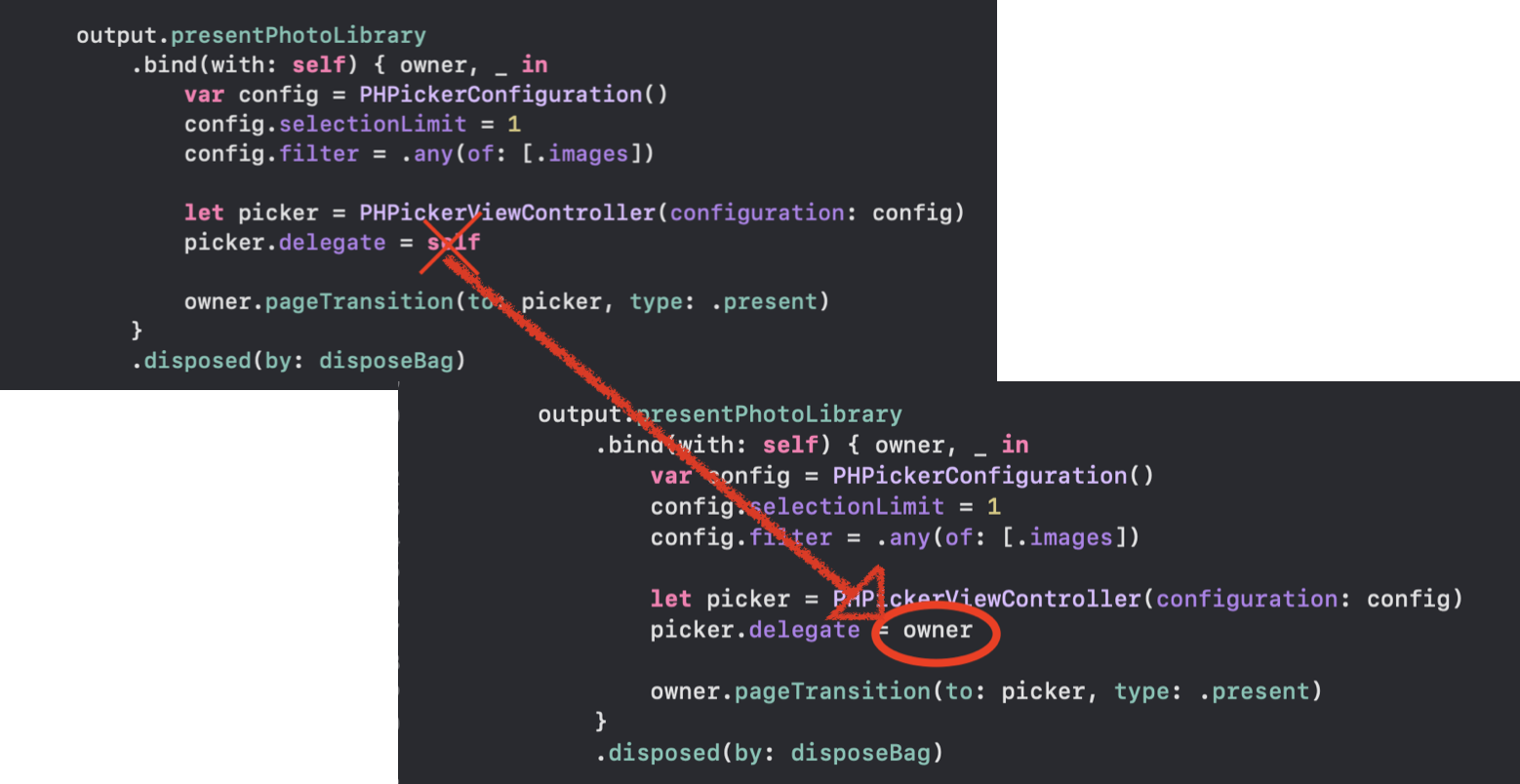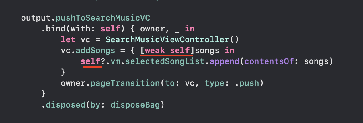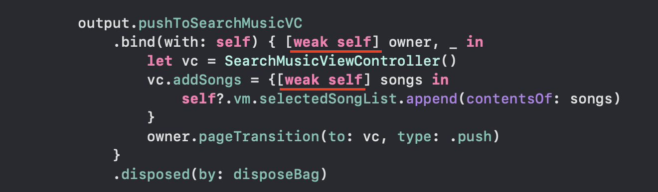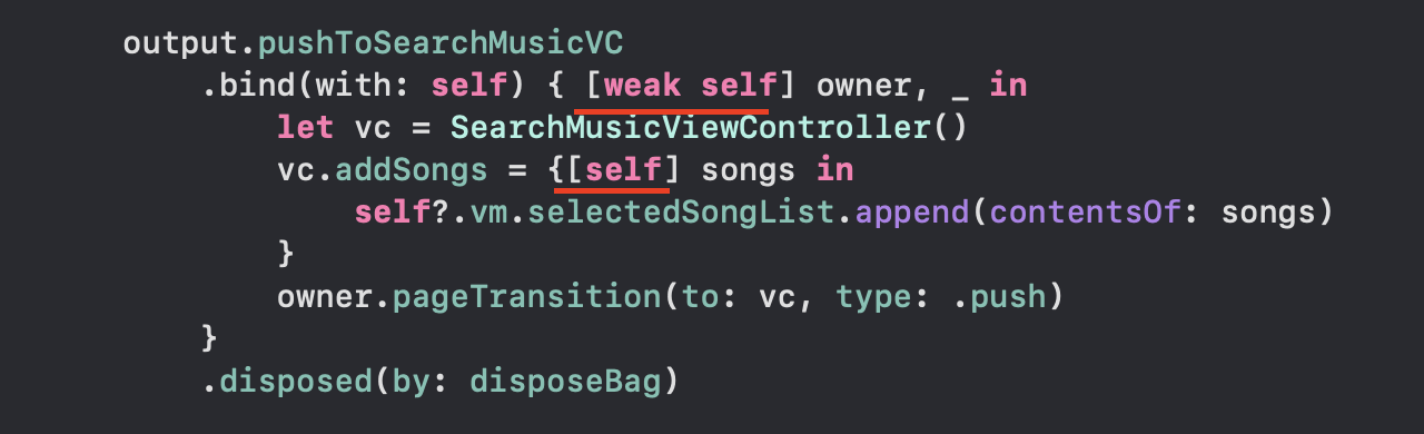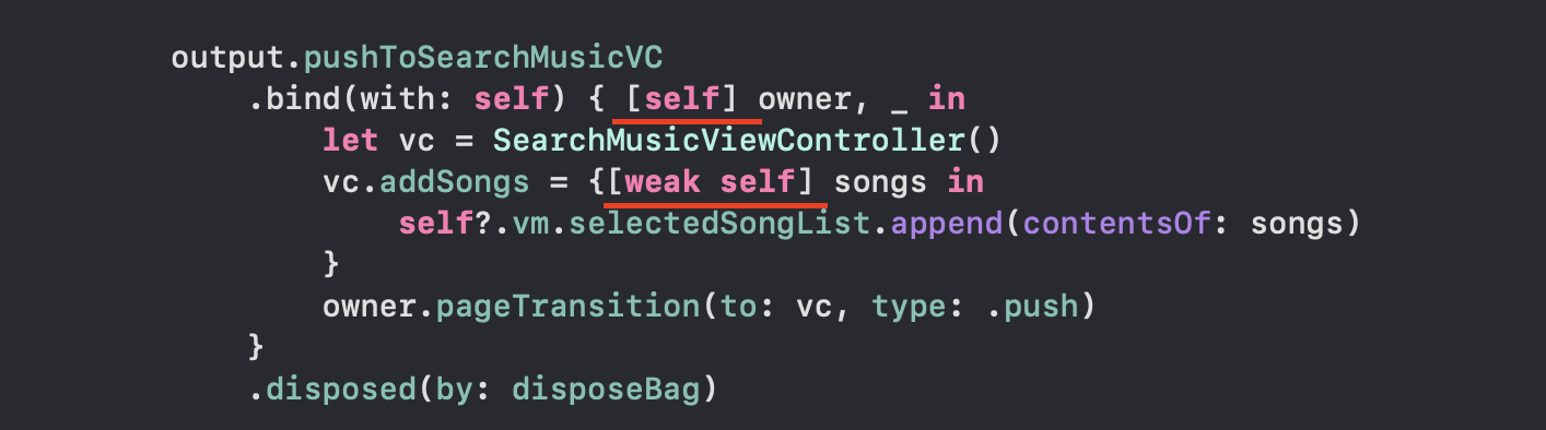 * ์ฐ๋ฆฌ๋ onNext ํด๋ก์ ์์ owner๋ผ๋ ์ด๋ฆ์ผ๋ก self์ ๋ํ ์ฐธ์กฐ ๊ณ์๋ฅผ ์ฌ๋ฆฌ์ง ์๊ณ ์ฌ์ฉํ๊ฒ ๋ค๊ณ ์์ฑํด ์ค ๊ฒ์ด์ง, self์์ฒด๋ ๊ฐํ๊ฒ ์ฐธ์กฐํ๊ณ ์๋ ๊ฒ์ด๋๊น์! (๊ทธ๋์ ์์ ์ฒซ ๋ฒ์งธ ์ฃผ์ ์์ ๋งํ๋ ๊ฒ์ฒ๋ผ ํด๋ก์ ๋ด์์ self๋ฅผ ์จ์ฃผ๋ฉด ๋ฉ๋ชจ๋ฆฌ๋ฆญ์ด ์ผ์ด๋๋ ๊ฒ์ด๊ณ ์.)