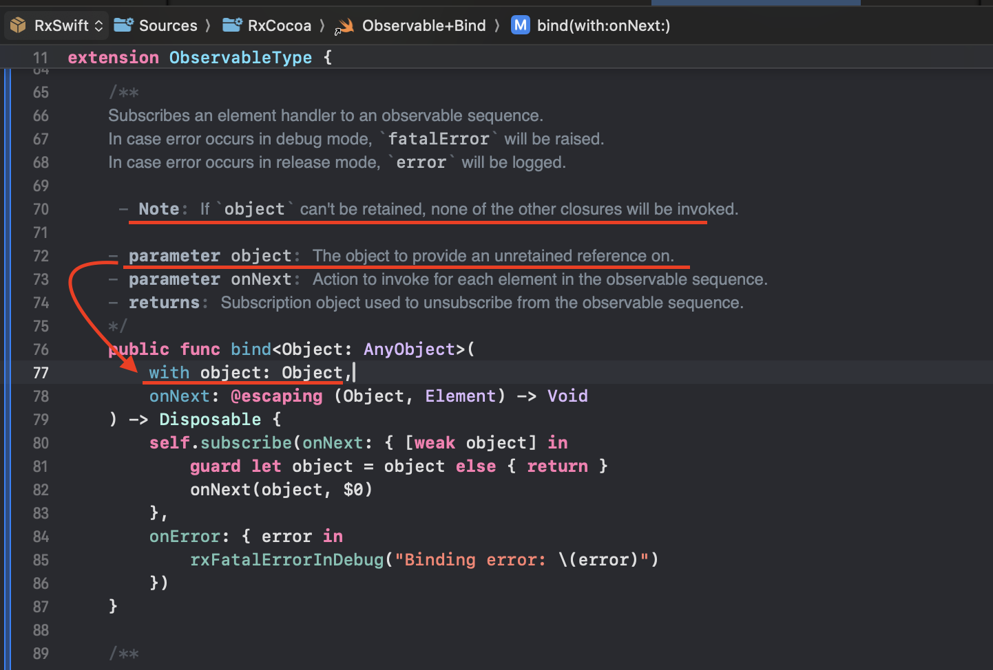 ์ฐ์ .bind(with:onNext:)๊ฐ ๋ญ์ง ์ ํํ ์์๋ณด๊ธฐ ์ํด RxSwift์ .bind(with:onNext:) ๊ตฌํ๋ถ๋ก ๊ฐ๋ณด๋ฉด with ์ ์ธ์๋ก๋ ๋ฌด์์ ๋ฃ์ด์ผํ๋์ง ์ค๋ช ํ๊ณ ์๋๋ฐ,