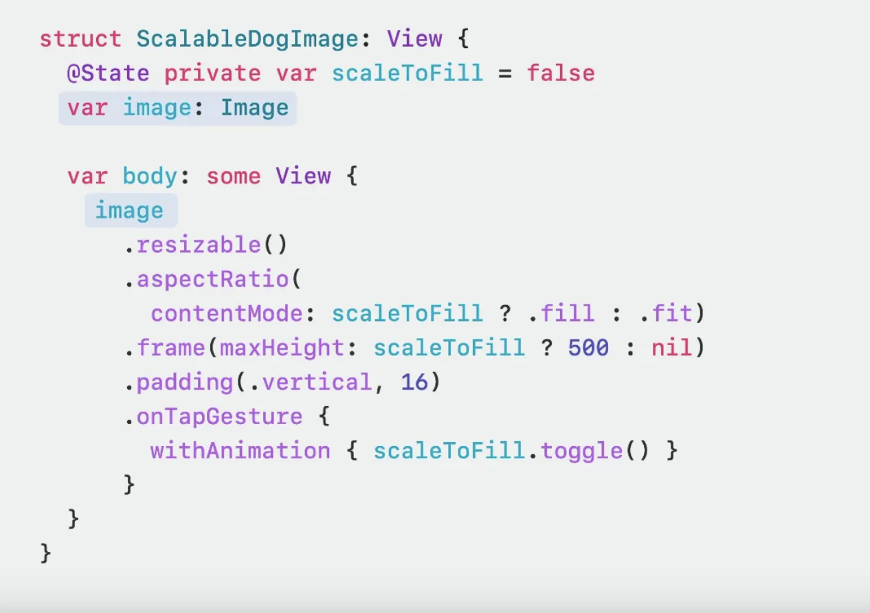 ScalableDogImage 이 뷰에서는 dog 데이터 중에서도 .image에 대한 데이터만 사용하고 있다. 그니까 dog.treat에 대한 데이터가 바뀐 것에도 뷰 업데이트가 되면 필요 없는 종속성을 가지고 있는 것!
