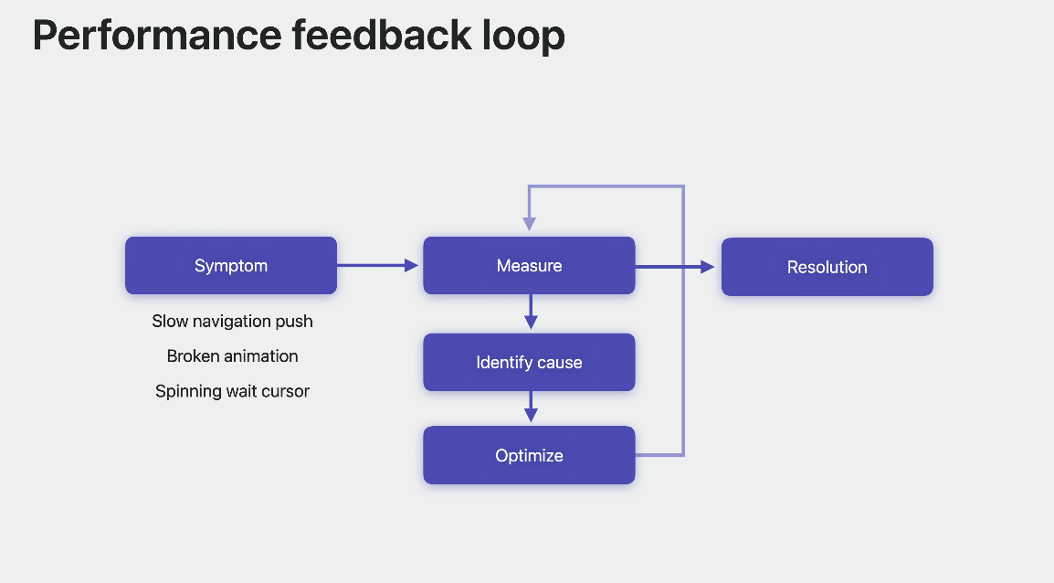 개인적으로도 어떤 "동작"이 안 되는 것을 해결하는 건 비교적 쉽지만, "성능" 문제에 대한 원인을 파악하고 개선하는 건 훨씬 더 생각을 많이 해야 하고, 어려운 부분이라고 생각한다. 이 세션에서는 많은 해결법에 대한 도구를 알고 있으면 위에서 말하는 루프를 끝내고 문제를 해결하기 수월하며, 이 세션에서는 그런 것들을 다룬다고 말한다. 이 세션은 대체적으로 성능적인 면 중에서도 view hierarchy가 느리게 업데이트되는 것에 대한 관점이 많이 들어가 있다.