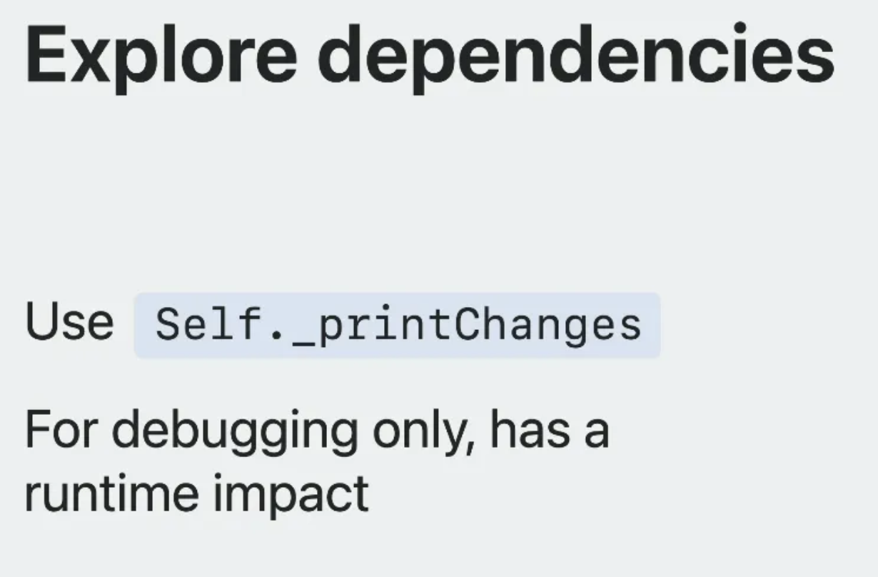 이 메서드를 body 안에서 실행하면 SwiftUI graph evaluator가 뷰의 body를 호출한 이유를 출력해 준다. (SwiftUI는 코드를 평가할 때 종속성을 바라보고 있다고 앞서 말했으니 → 어떤 종속성이 바뀌었을 때 뷰가 다시 그려지는지를 알려주는 메서드라고 미루어 짐작할 수 있다.) 그래서 이러한 출력을 지원하는 메서드를 사용해서 필요 없는 의존성이 있는지 확인할 수 있다