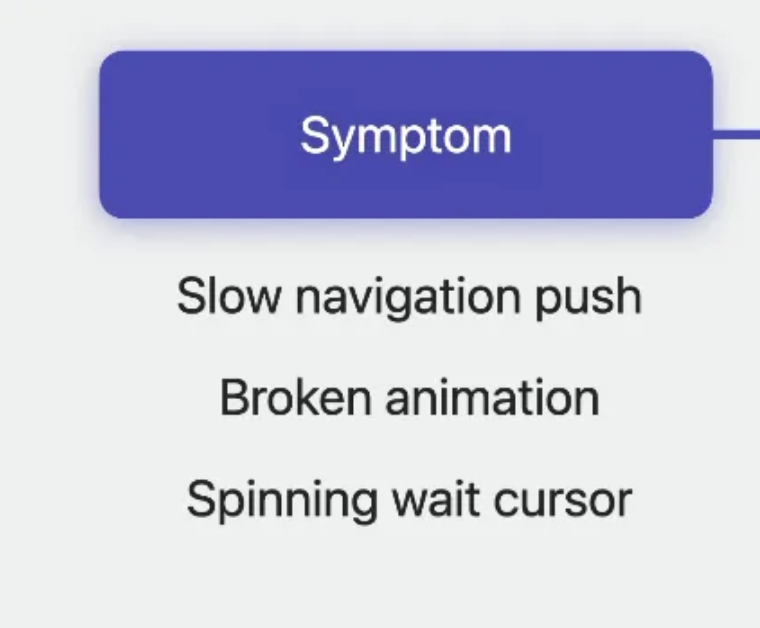 우리는 아래와 같은 증상(symptom)을 통해 성능에 대한 문제를 인지한다. (네비게이션 화면 전환이 늦거나, 애니메이션이 제대로 안되거나, macOS의 경우 커서가 스피닝으로 지속되는 것에 대한 증상 )
