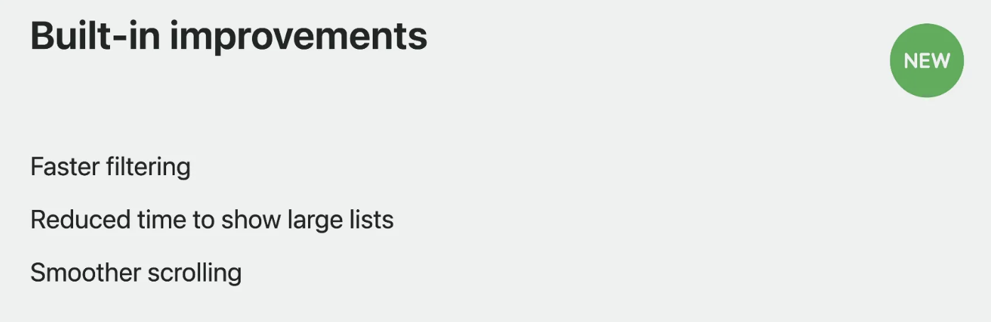- 대량의 데이터를 가진 List와 Table의 업데이트가 빠르게 반응할 수 있도록 개선되었다고 한다.
