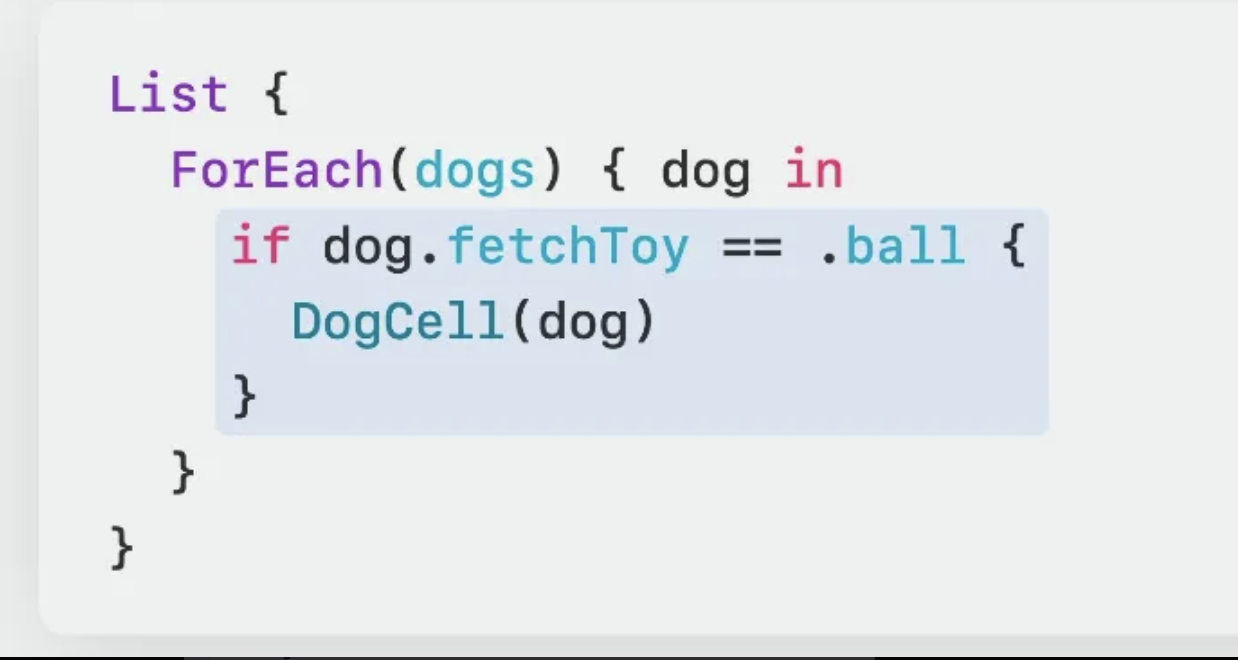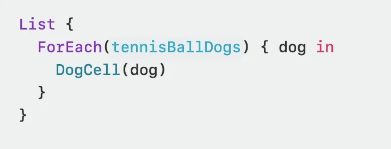 - 데이터 컬렉션을 결과 뷰에 맵핑하고 각 뷰에 대해 명시적인 식별자(explicit identity) 제공한다. ( explicit identity와 structural identity가 뭔지 궁금하다면 위에서도 말한 WWDC21 Demystify SwiftUI 이 세션 추천!)