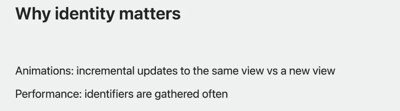 Identity helps SwiftUI manage view lifetime, which is crucial for incremental updates to your hierarchy.