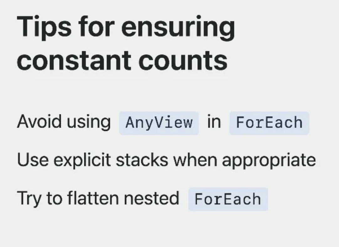 - 데이터 각 요소별로 생성되는 뷰의 개수와 구조에 대해 SwiftUI가 잘 인지할 수 있도록 설계해서(AnyView사용하지 않기, 조건부로 row 그려주지 않기 등) 총 row의 개수를 파악할 수 있도록 하자