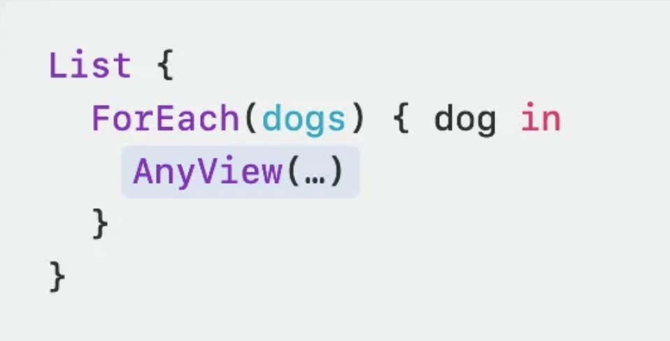 AnyView는 SwiftUI 입장에서 뷰에 대한 정보를 모르기 때문에 어떤 구조로 , 몇 개의 뷰가 들어가 있는지 몰라서 List가 총 row의 개수를 모르게 되고 위의 경우와 동일하게 row identifier를 검색하기 위해 모든 뷰를 빌드해야 하는 결과를 낳는다.