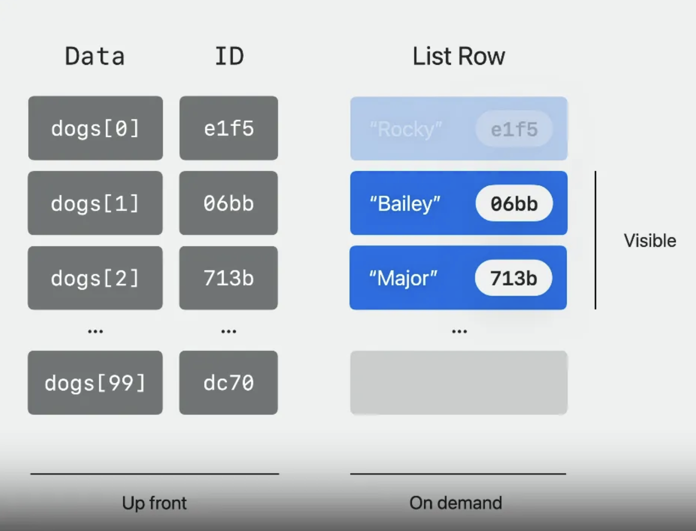 - List를 사용할 때는 내부에 몇 개의 요소(열, Row)가 들어가는지, 각 열이 어떤 식별자를 가지는지 파악해야 하는데 ⇒ 그러기 위해서는 ForEach는 데이터를 미리(up front) 방문해서 각 요소의 식별자를 확인해야 하는 것이다.